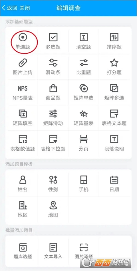 6、点击添加题目,可以选择单选题、多选题等类型;