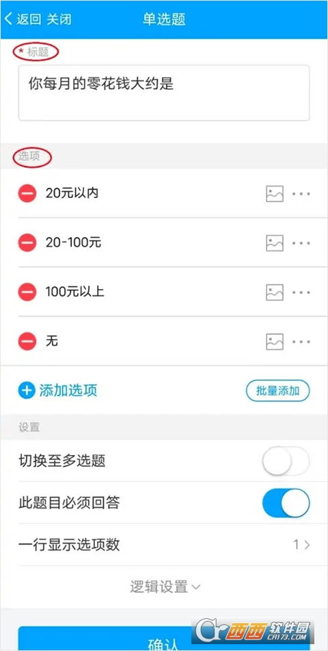 8、依次输入问卷标题和答案选项,添加完成后点击保存;