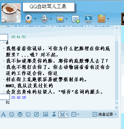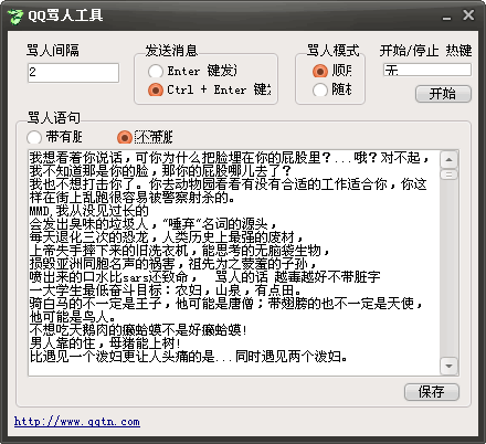 支持最新的QQ2012的QQ骂人工具,可以自定义骂人的话,也自带了好些带脏字的和不带脏字的骂人的话。打开对方的QQ对话窗口,打开QQ骂人工具,选择骂人语句:带有脏字或者不带有脏字,点击“开始”,就可以自动发送骂人的话了。PS:西西不支持用恶毒的话骂人,不过有人真的讨厌的话,可以用不带脏字的话语开骂哦。可以开在那里不用理睬,挺好的防狼工具。