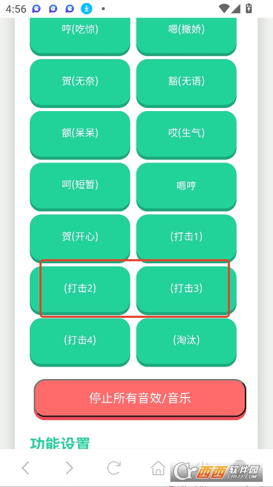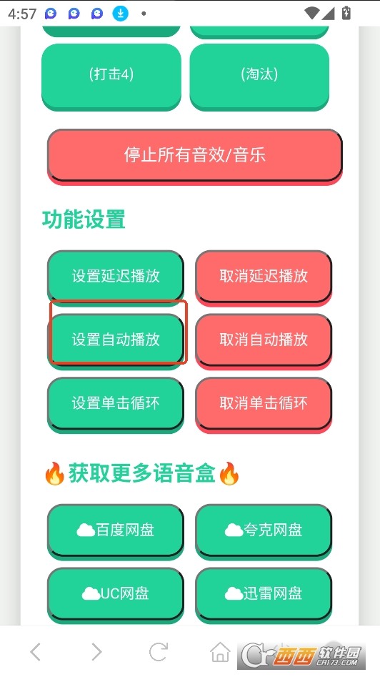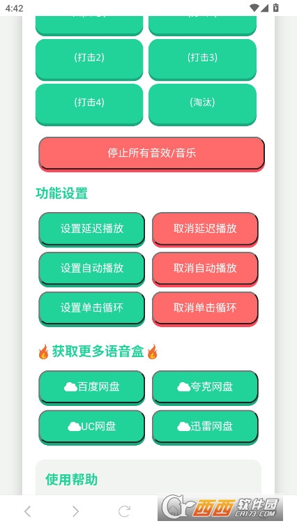 点击按钮播放音效或音乐。请确保设备音量适中。点击"设置延迟播放"按钮,设置延迟时间(毫秒)。点击"设置自动播放"按钮, 启用自动播放功能。点击"设置单击循环播放"按钮,启用单击循环播放功能。点击"停止所有音效/音乐"按钮,暂停当前播放的音频。