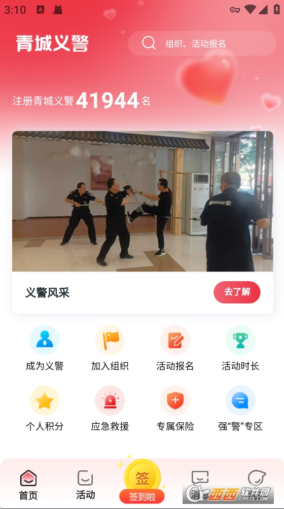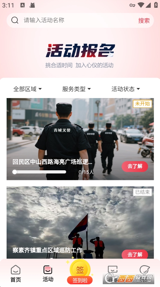 活动参与与管理:义警可便捷浏览、报名参与平台发布的各类活动,如社区值守、大型活动安保、反诈宣传等,活动期间支持在线签到与签退。