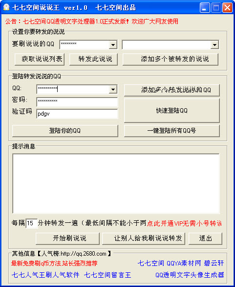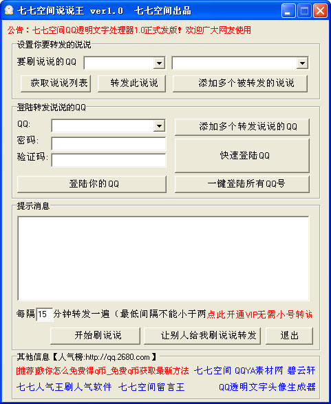 七七说说王是目前最好用的QQ空间说说转发软件,刷空间说说转发软件,可用多个小号对多个大号转发说说的说说转发工具。