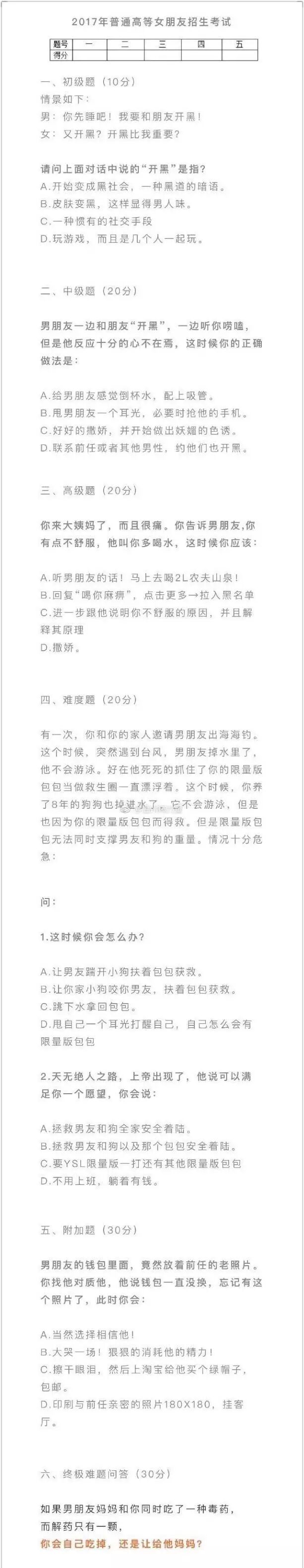 最近赶着高考的热点,有网友制作出了一份2017普通高等男/女朋友招生考试试卷,这份试卷对男生相当的不友好,基本做不好就相当于送命题。相信广大的单身男女或者已经有男女朋友的人都对男生和女生理想中的伴侣非常感兴趣,其实这个题目编的还是挺到位的,大家可以测测看自己能得几分。