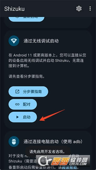 3、开发者模式开启后即可启用无线调试功能,然后打开Shizuku后点击无线调试功能输入配对码