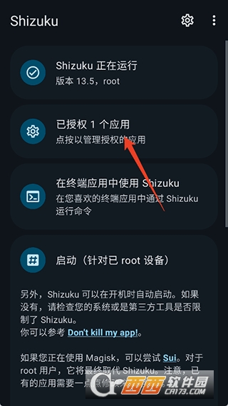 1、这个软件使用十分简单,但用户需要先启动手机中的Shizuku(没有安装Shizuku软件的可以在本站搜索下载)