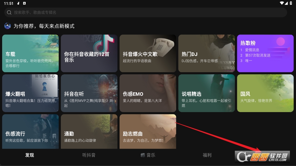 2. 在主界面,您可以选择【推荐】、【歌单】、【排行榜】等功能模块浏览音乐资源;