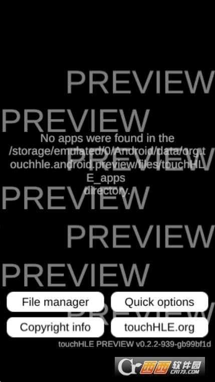 警告:在某些设备上,“文件管理器”按钮将打开一个文件管理器,但是实际做文件操作的时候会死机(这很可能是Android的bug,我们还没能调试出来)。如果你遇到这种情况,请从最近的应用程序列表中清除该文件管理器,并尝试直接导航到设备的文件管理器应用程序,而不是通过touchHLE UI。