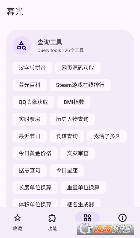 暮光工具箱app安卓版下载是一款专为安卓用户打造的多功能集成型实用工具应用,致力于成为你手机中的“瑞士军刀”。无论是日常美化、办公提效,还是娱乐畅享、隐私保护,它都能一站式满足你的多样化需求。简洁直观的界面设计搭配极速响应的操作体验,让每一位用户都能轻松驾驭,玩转智能生活!