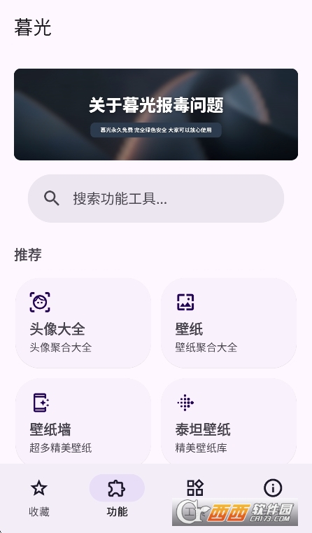 暮光工具箱是一款集多功能于一体的安卓实用工具箱应用,核心满足用户日常生活、办公学习及娱乐需求,适合有多样手机工具使用需求的安卓用户,无论是换壁纸、下短视频,还是用其他实用功能,都能轻松满足。软件内置海量高清壁纸,支持短视频无水印解析,操作简单直观,新手打开后不用复杂学习,几分钟就能上手使用,不用下载多个单一工具,一个应用就能覆盖多场景需求,实用性很强。