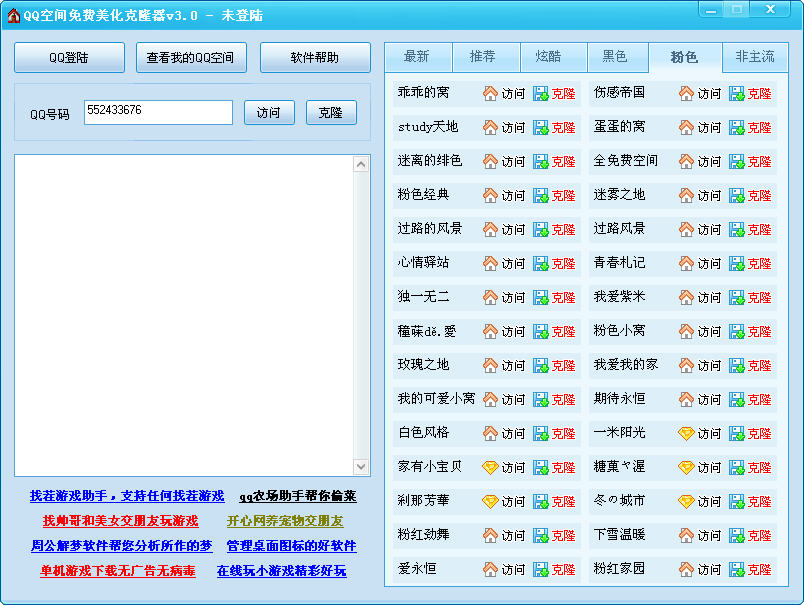qq空间免费美化克隆器,可以瞬间将别人漂亮的qq空间装扮克隆到自己的空间!通过克隆空间让您的 qq空间变得更加绚丽!由我们开发的QQ空间美化克隆器可以快速准确免费的装备QQ空间,并且装扮不需要任何技术和困难, 软件只是傻瓜式操作即可!软件特点:1.登陆您的QQ空间2.填写准备克隆的QQ空间号,然后一键克隆。3.打开你的空间看看吧,就这么简单!4.智能克隆模式,只需三步即可完成..