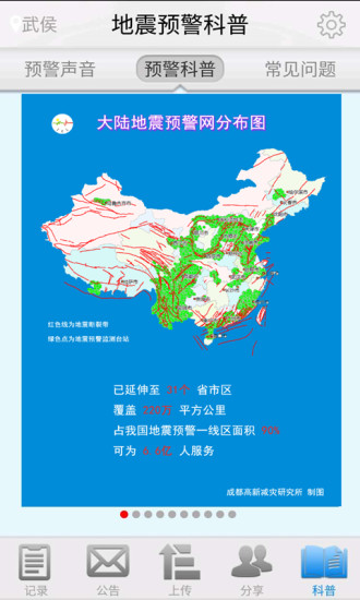 成都高新减灾研究所与地方地震局等合作已建设延伸至我国31个省市区的大陆地震预警网,覆盖220万平方公里,占我国地震预警人口密集多震区面积的90%。