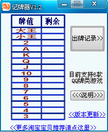 使用说明: 1、在使用本软件前,先请您看一下您现在玩的游戏是否在本软件的支持的列表内,而且版本号是否一致。如果版本不一致,请点击主界面中的“版本更新”按钮下载最新版本。 2、本记牌器有两个特色: 一、在显示外面剩余牌时,如果剩余大于等于4,则显示红色,这样方便查看是否还有炸弹。 二、在显示出牌记录时,按出牌轮次对齐,显示红色表示新一轮的开始,方便回顾出牌过程。