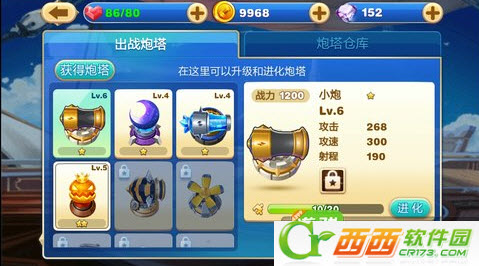【炮塔】:这里是你培养炮塔的地方,在这里你可以查看、合成、进化、购买、出售你的炮塔。