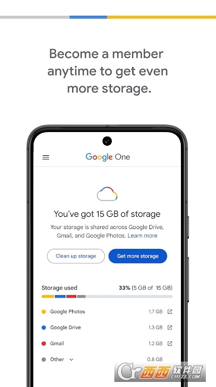 Google One2025最新版下载为用户提供了一个便捷的方式来管理和扩展云端存储空间。用户可以查看在 Google 云端硬盘、Gmail 和 Google 相册中的存储使用情况,并使用内置的存储空间管理器来轻松释放不必要的文件,确保存储空间的有效利用,欢迎来下载吧。