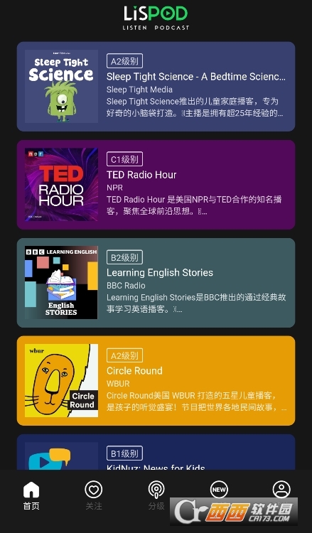 分级内容展示与推荐功能:软件内按英语水平(初级启蒙到专业水准)和考试类型(KET、PET、FCE、四六级、剑桥雅思等)展示分级播客内容,每个级别和考试类别下有详细的内容介绍(如主题、难度、适用人群)。支持根据用户的英语水平和备考目标推荐合适的播客,方便用户快速找到匹配内容。