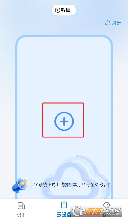 3、登录后,在主界面点击下方的“云设备”选项,然后点击页面上方的“新增”按钮来添加云设备。