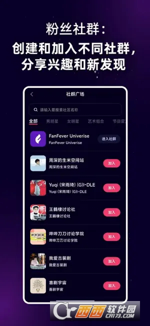 2、艺人覆盖广泛,跨领域满足需求。平台不仅聚焦CPOP音乐领域的歌手、组合,还覆盖影视领域的演员、导演,以及体育领域的运动员等多领域全球艺人,无论是追踪偶像的音乐作品、影视新剧,还是关注其综艺行程、公益活动,粉丝都能在此找到全面的艺人动态。这种跨领域覆盖模式,让粉丝无需为不同领域的偶像下载多个软件,真正实现“一个平台追遍多元偶像”。