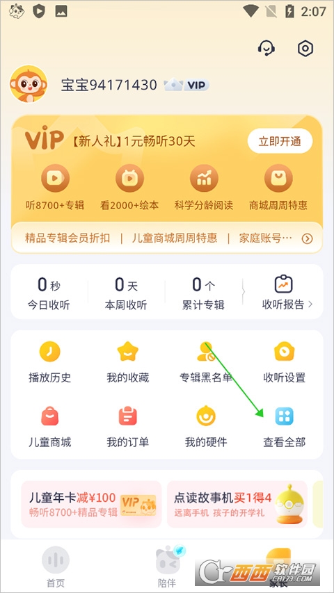 1、打开并登录喜马拉雅儿童APP,点击进入家长页面中点击【查看全部】(下图绿色箭头所指)。