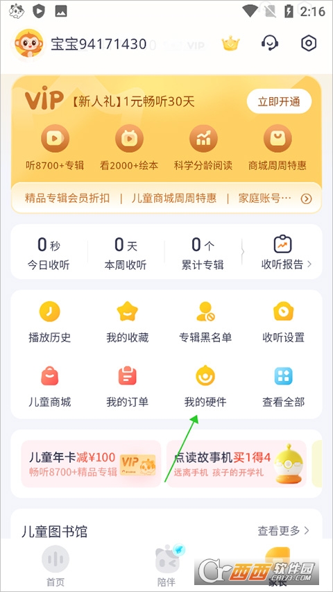 1、进入家长页面中,点击【我的硬件】(下图绿色箭头所指)。